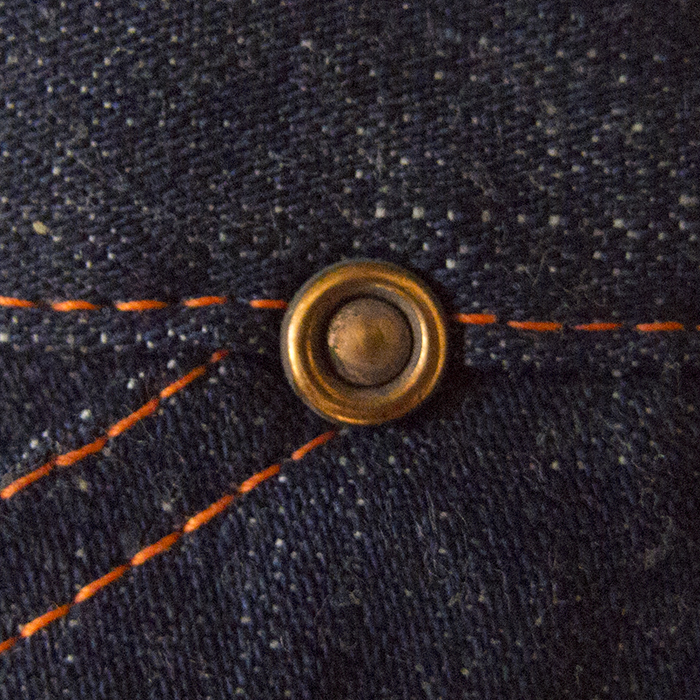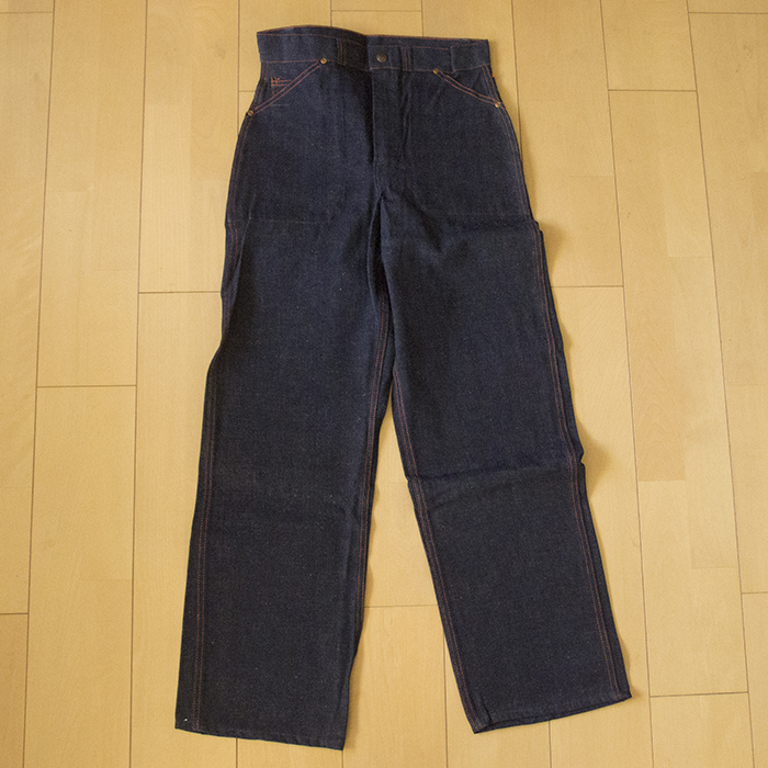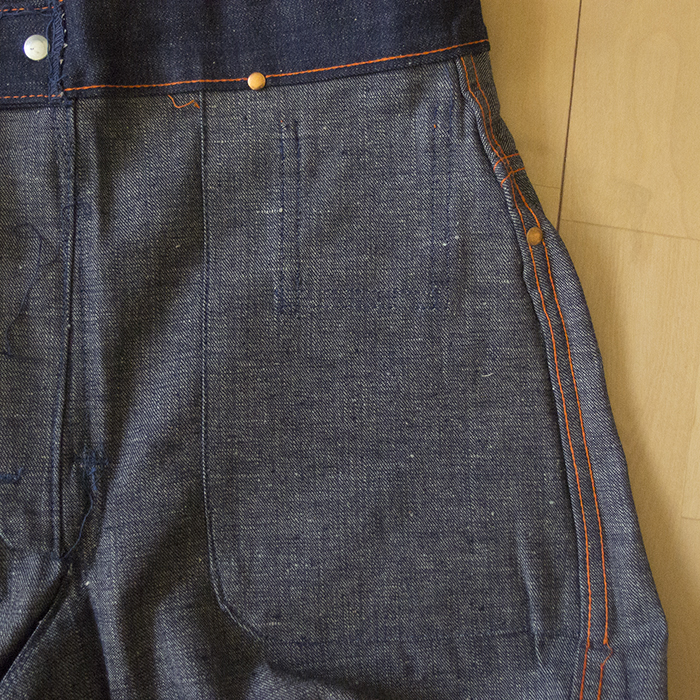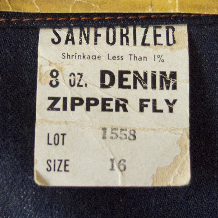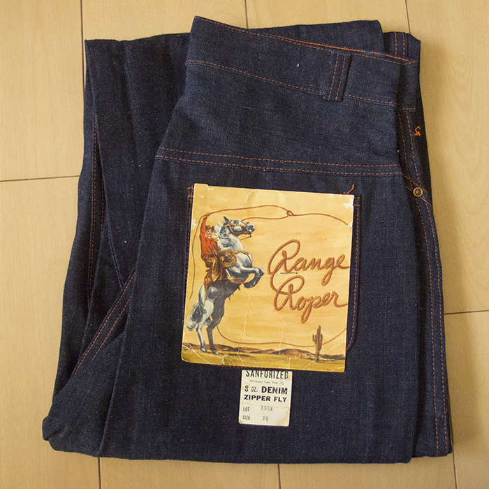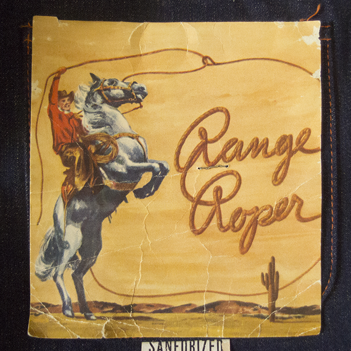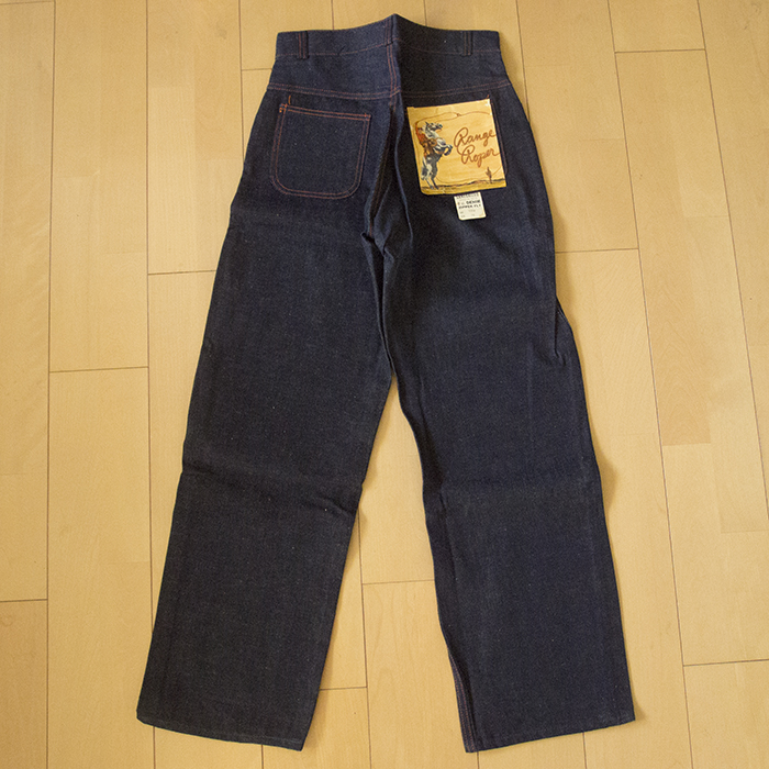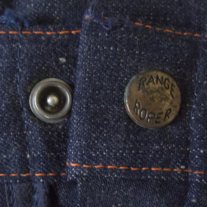 The brand name can be identified as "Range Roper" from the engraving on the flasher and top button, but no details about the brand are known. 5-pocket jeans in 2×1 light-ounce denim. The use of a U-shaped zipper suggests that it may have been made in the 1940s or 1950s.
