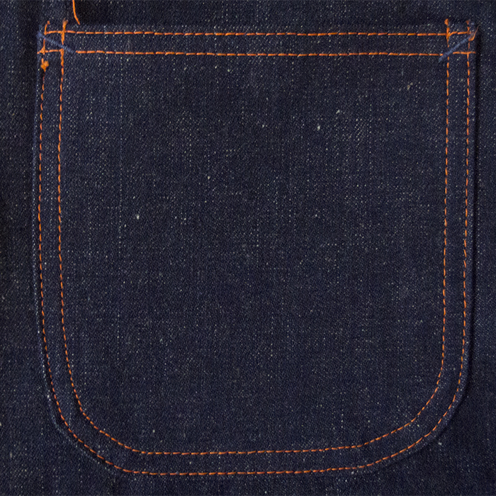A paper tag attached to the bottom of the right back pocket, stating that it is made from 8 oz denim.
