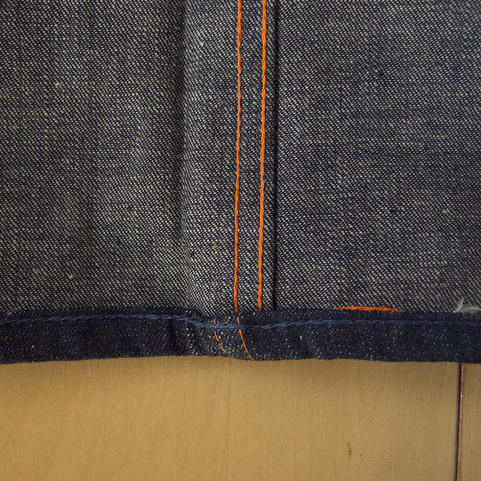 The hem is a dark blue chain stitch. At the hem, the selvedges of the fabric are not visible.