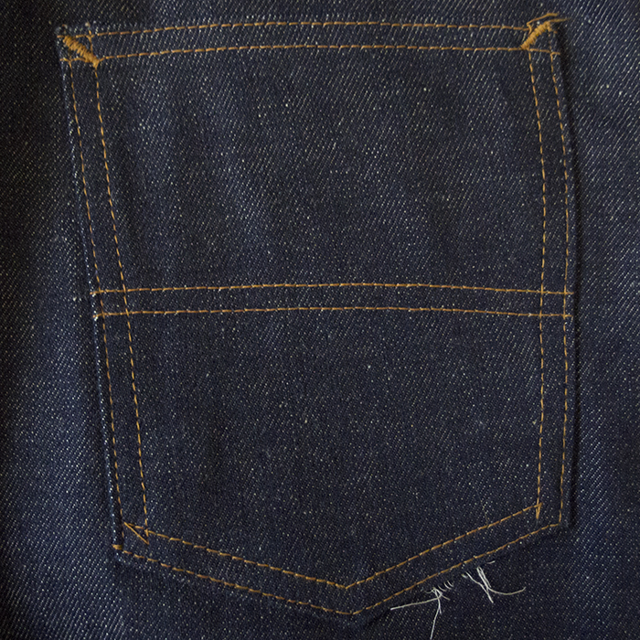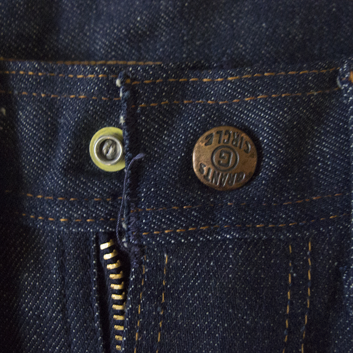 W. T. Grant was one of the largest chain stores in the United States and apparently also produced and sold clothing. Here are the company's jeans in a light ounce fabric. There is no flasher or other material attached, but the use of a cam-lock zipper suggests that it was produced in the late 1950s-1960s. W. T. Grant is described in detail in Wikipedia.