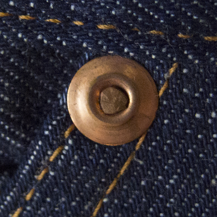 The shape is similar to that used on LEE jeans, but without the branding. The reaction of the magnet suggests that it is made of copper-plated iron.