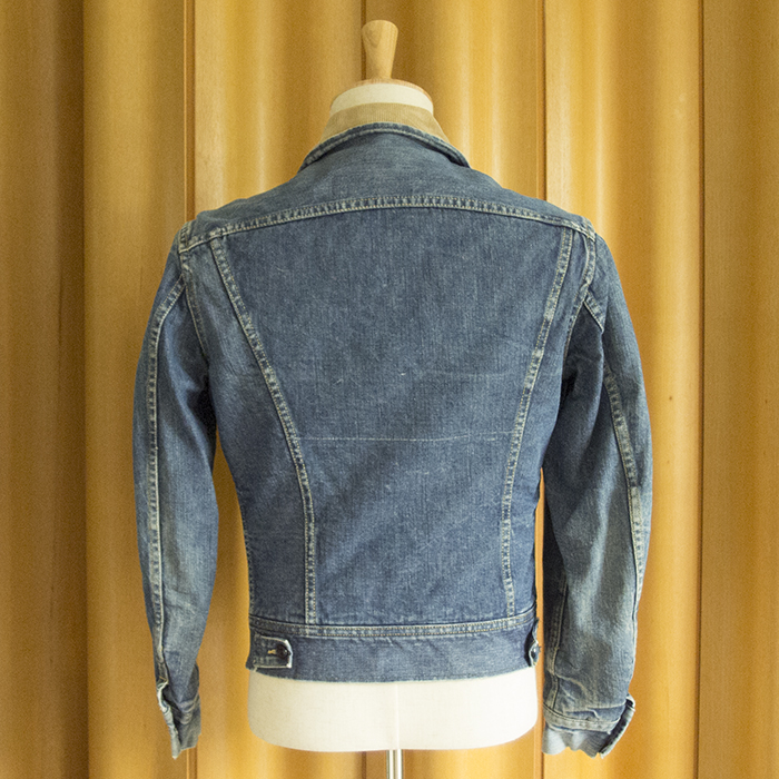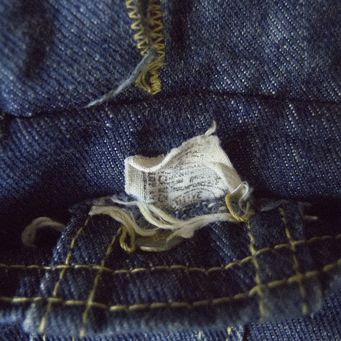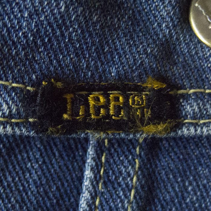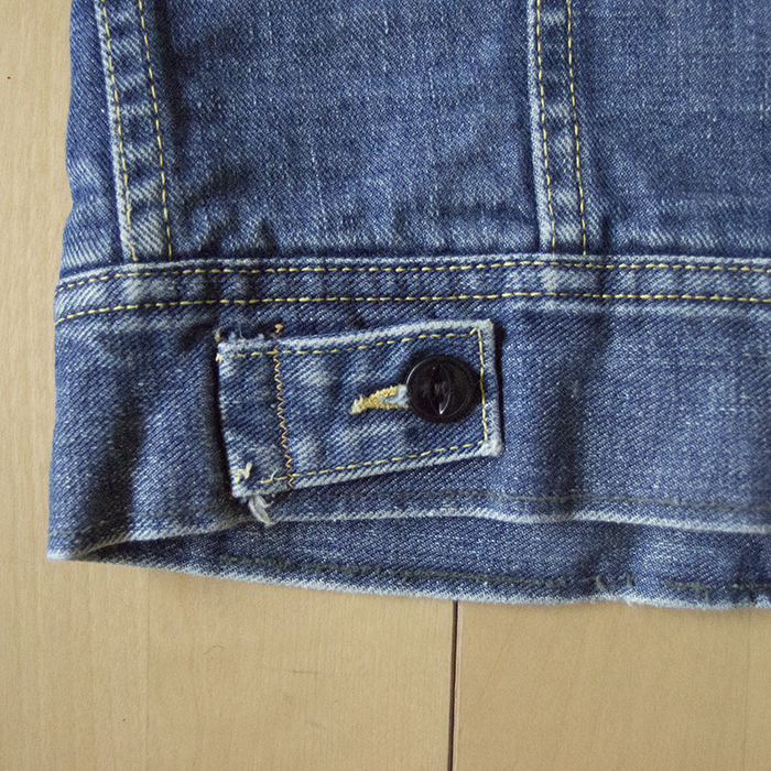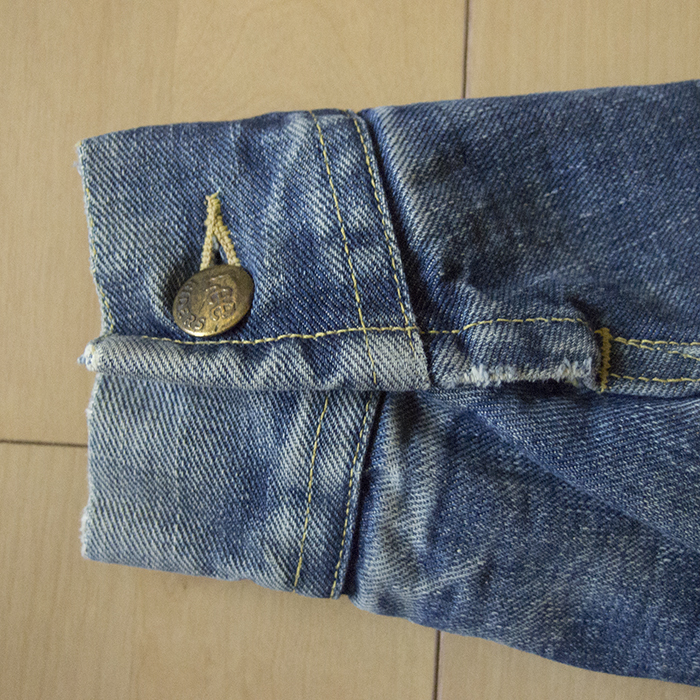 "Lee RIDERS" stamped button. This button is still attached straight up, but the one from this era has the top and bottom engraving upside down. Some parts are buttoned up in state.