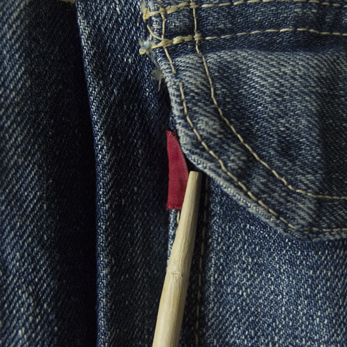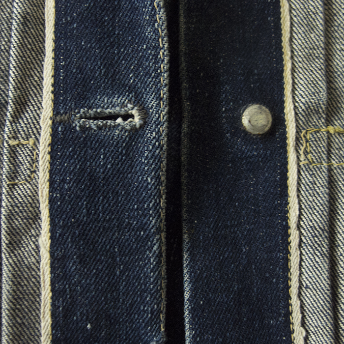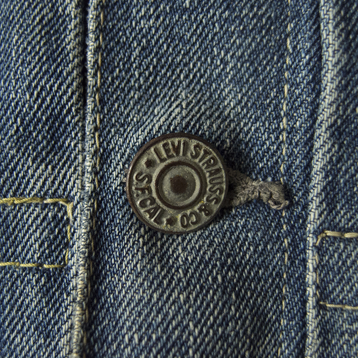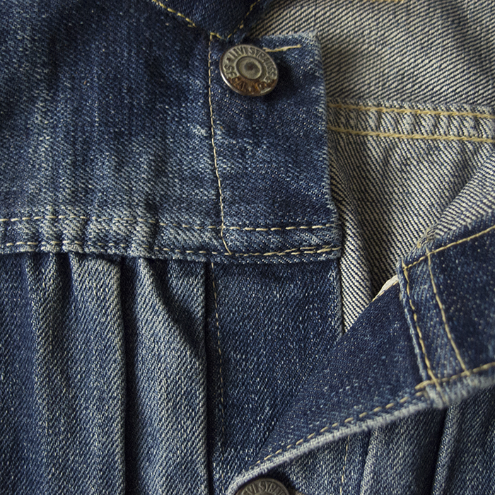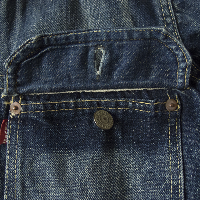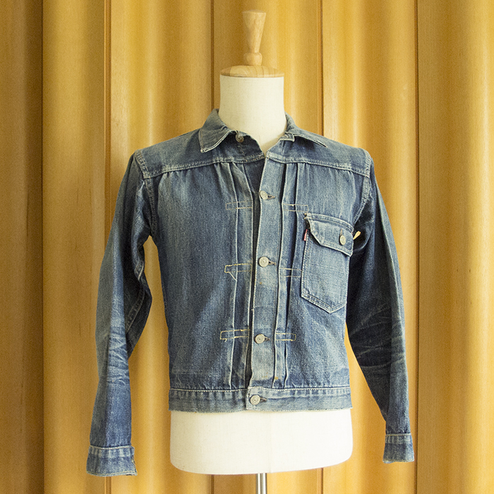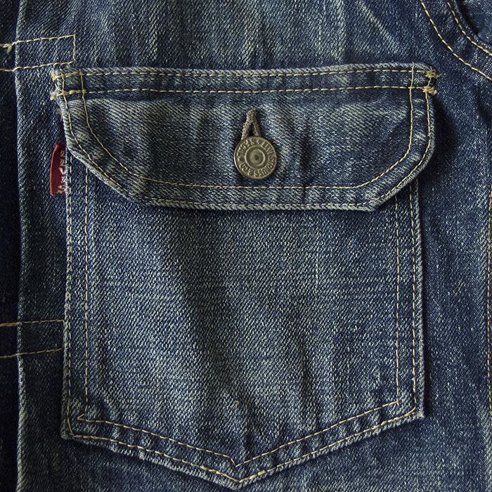 The Levi's First Type Jacket 506XX has different specifications depending on when it was produced, but we can assume that it was produced between 1937 and 1942 because (1) the front buttons and box stitching are out of alignment, (2) it has a red tab, (3) the cinchback hardware is with a needle, and (4) the engraving of the letters on the front buttons is much deeper.