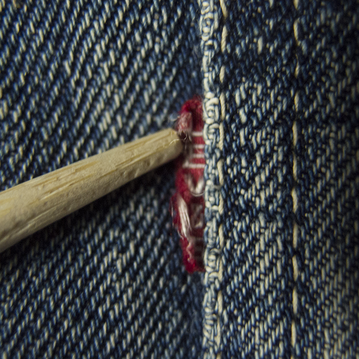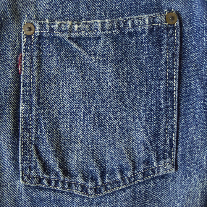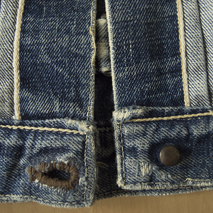 The selvedges are used for the front. Also, the back of the front button is domed. Note that the buttonholes have been reinforced by repair and are different from the original condition.