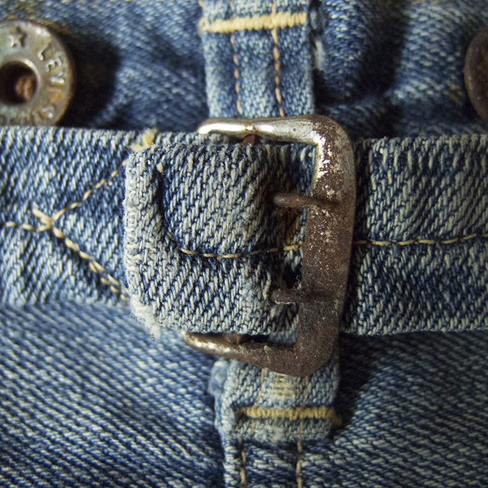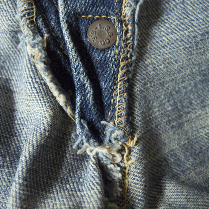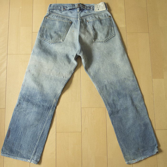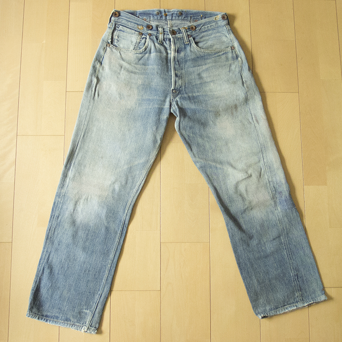 リーバイス501の廉価版であるリーバイス201で、バックポケットが剥き出しリベットになっており、シンチバック、サスペンダーボタン、ベルトループがすべて付いていることから、501でいう1922年モデルに相当する1920~30年代までに製造されたものと考えられる。501で使用されていたNo.1デニムよりもライトオンスのNo.2デニムが使用されているのが一番の特徴で、当時、リーバイス501よりも廉価で販売されていた他社製品に対抗するためにコストを抑えた商品として販売されていたようである。リペアの箇所も多く、決して状態がいいとは言えないが、欠損しやすいリネンパッチは幸い残っている。