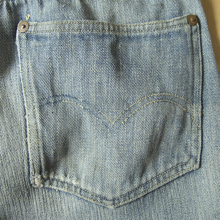 バックポケット上は、剥き出しリベットで補強されている。アーキュエイトステッチは、ほとんど消失しているが、あまりいびつな形にはなっていない。写真は右ポケットであるが、赤タブは付いていない。