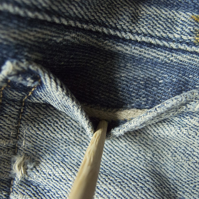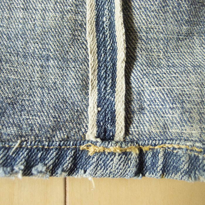 元々は青耳であったのではないかと思われるが、退色してしまったのか判別できない。裾は、シングルステッチで縫われているが、縫い糸の様子が他のステッチとは異なっており、残念ながら裾下げされてしまったのではないかと推測される。