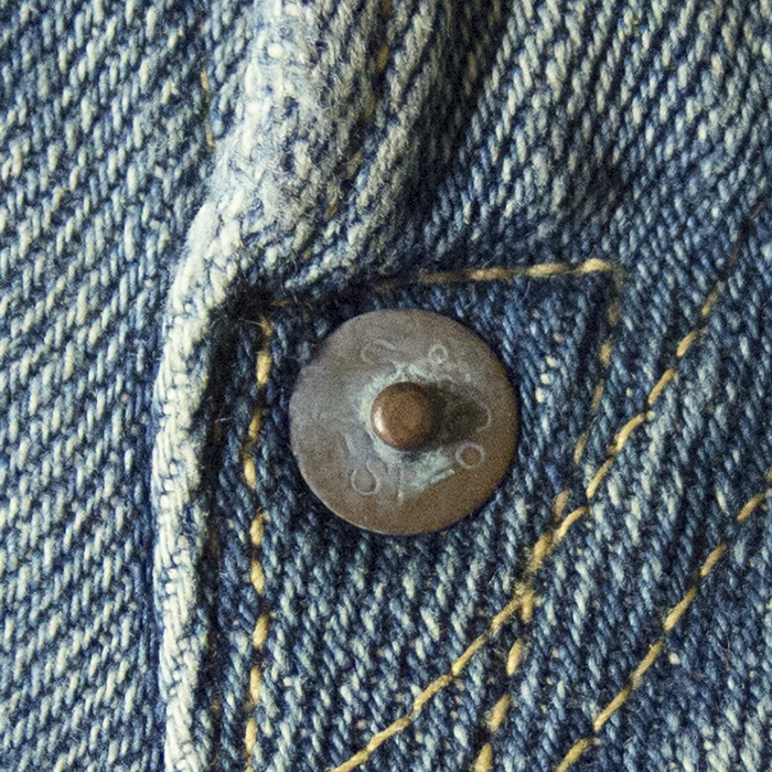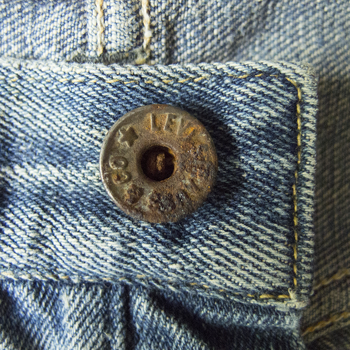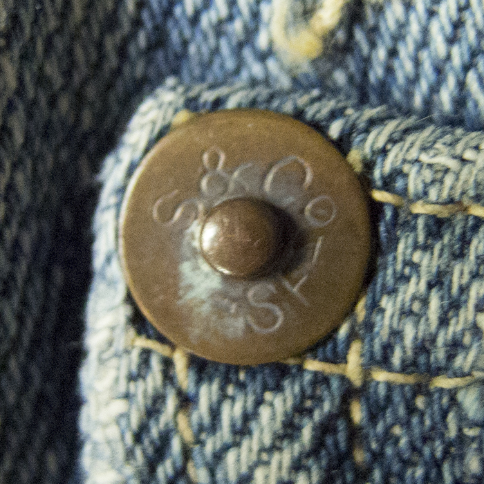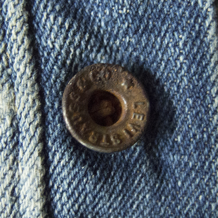 ドーム型になっているトップボタン裏。鉄製である。写真では分かりにくいが、ウエストベルト下はピッチの細かいチェーンステッチになっており、大量生産用のミシンが使われた後に製造されていたことが推測される。